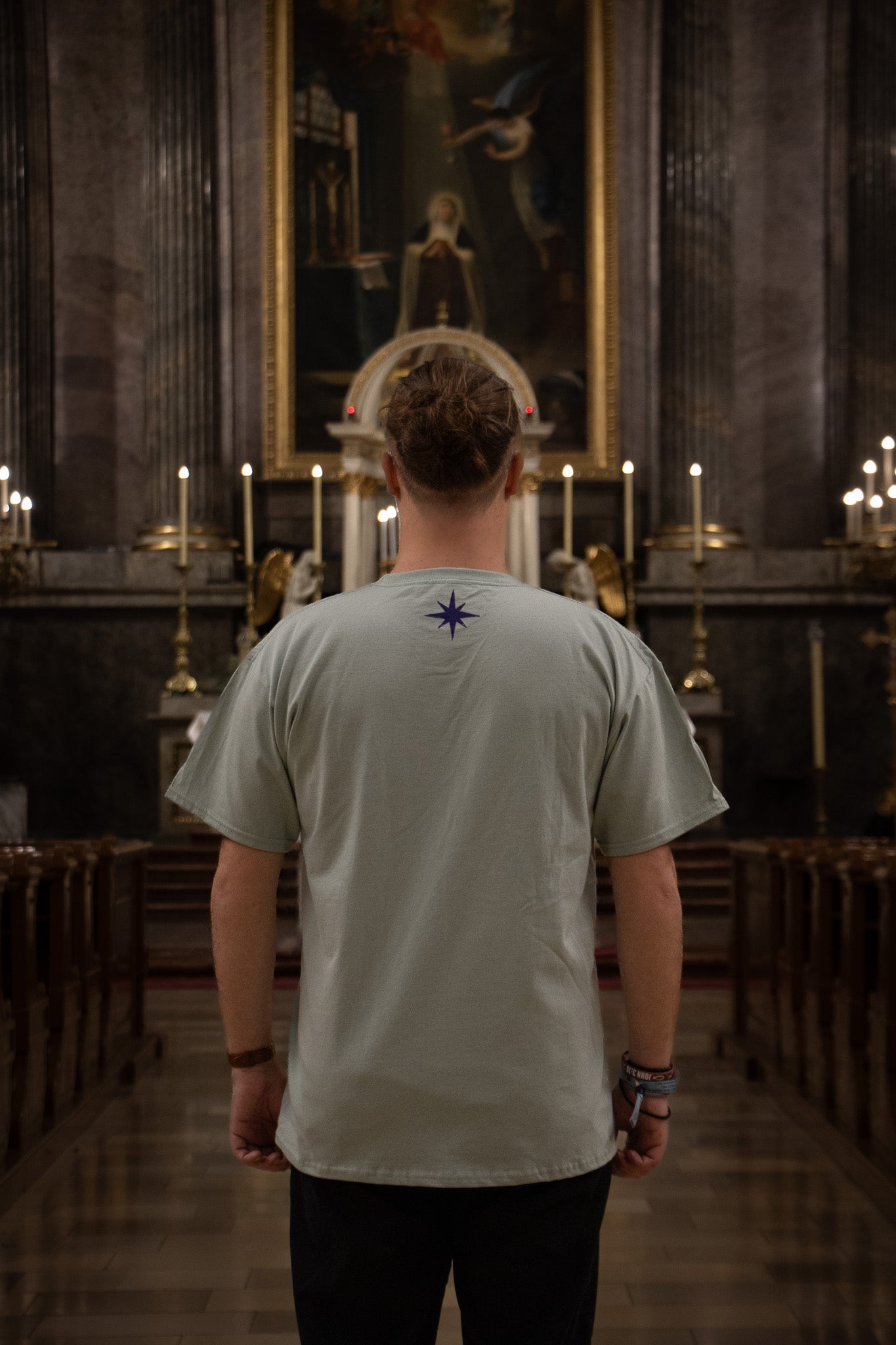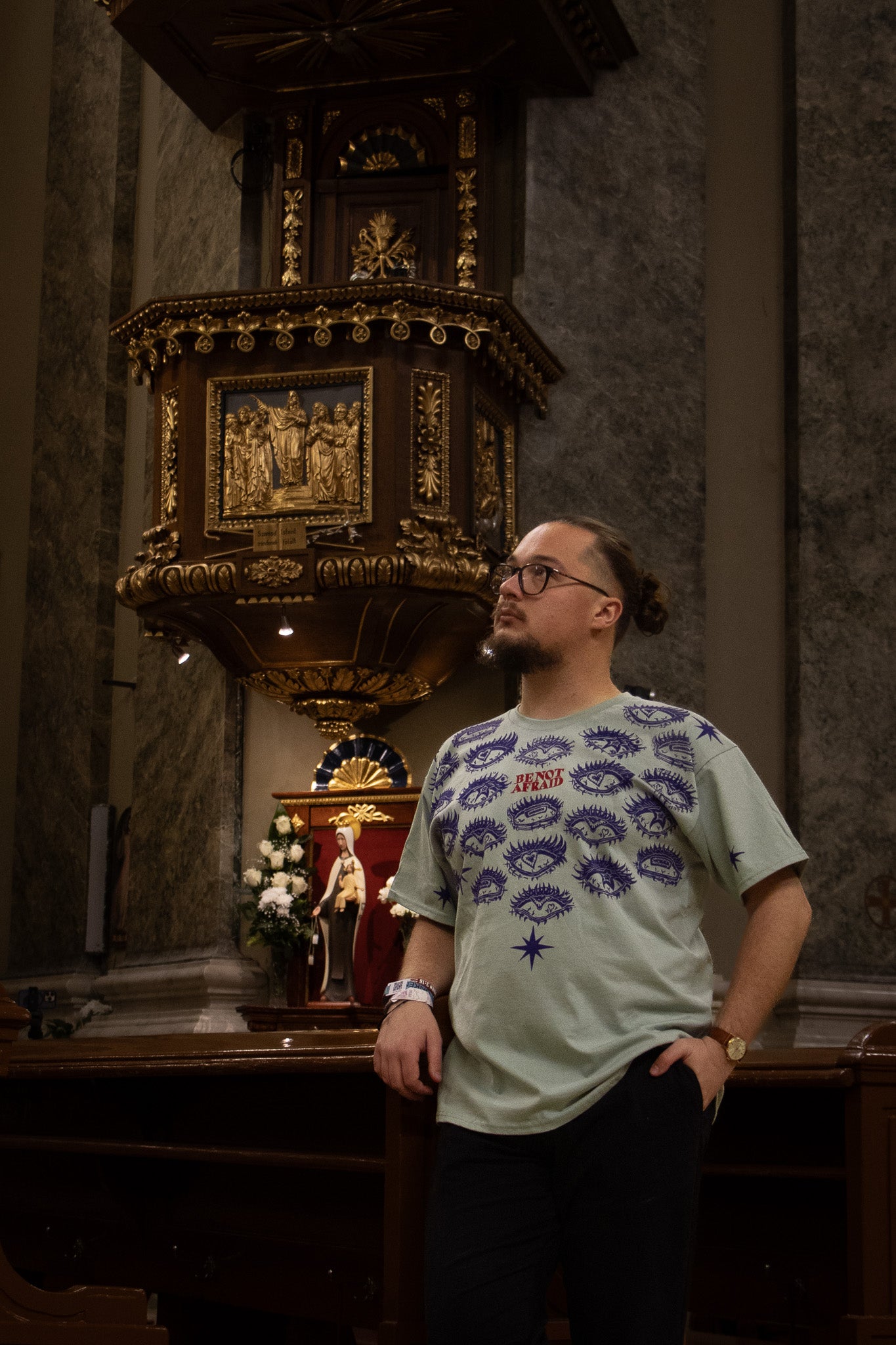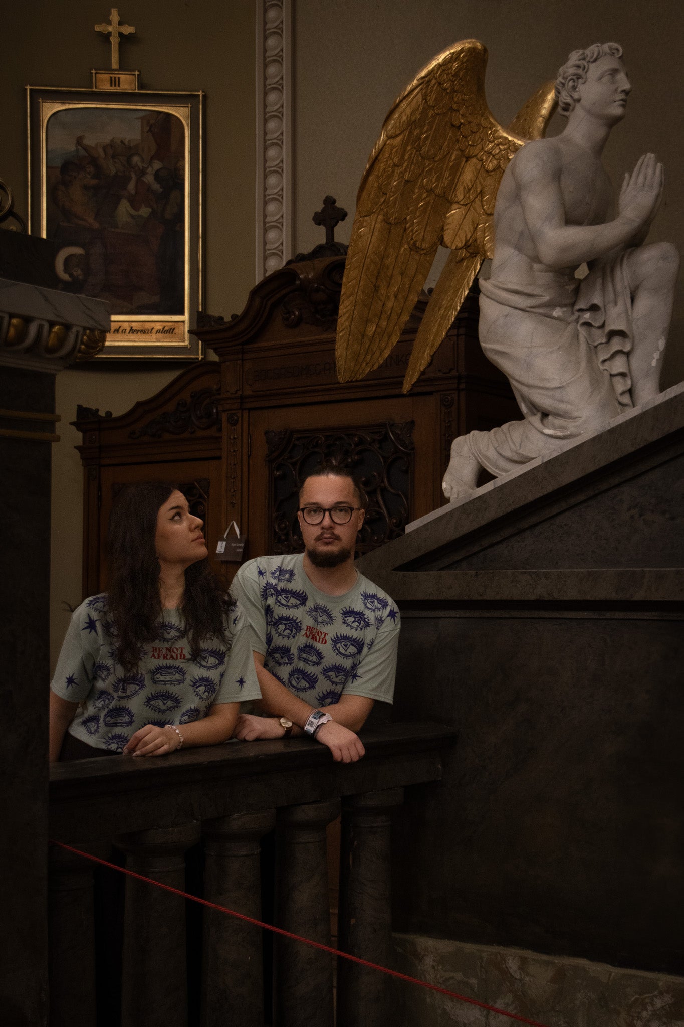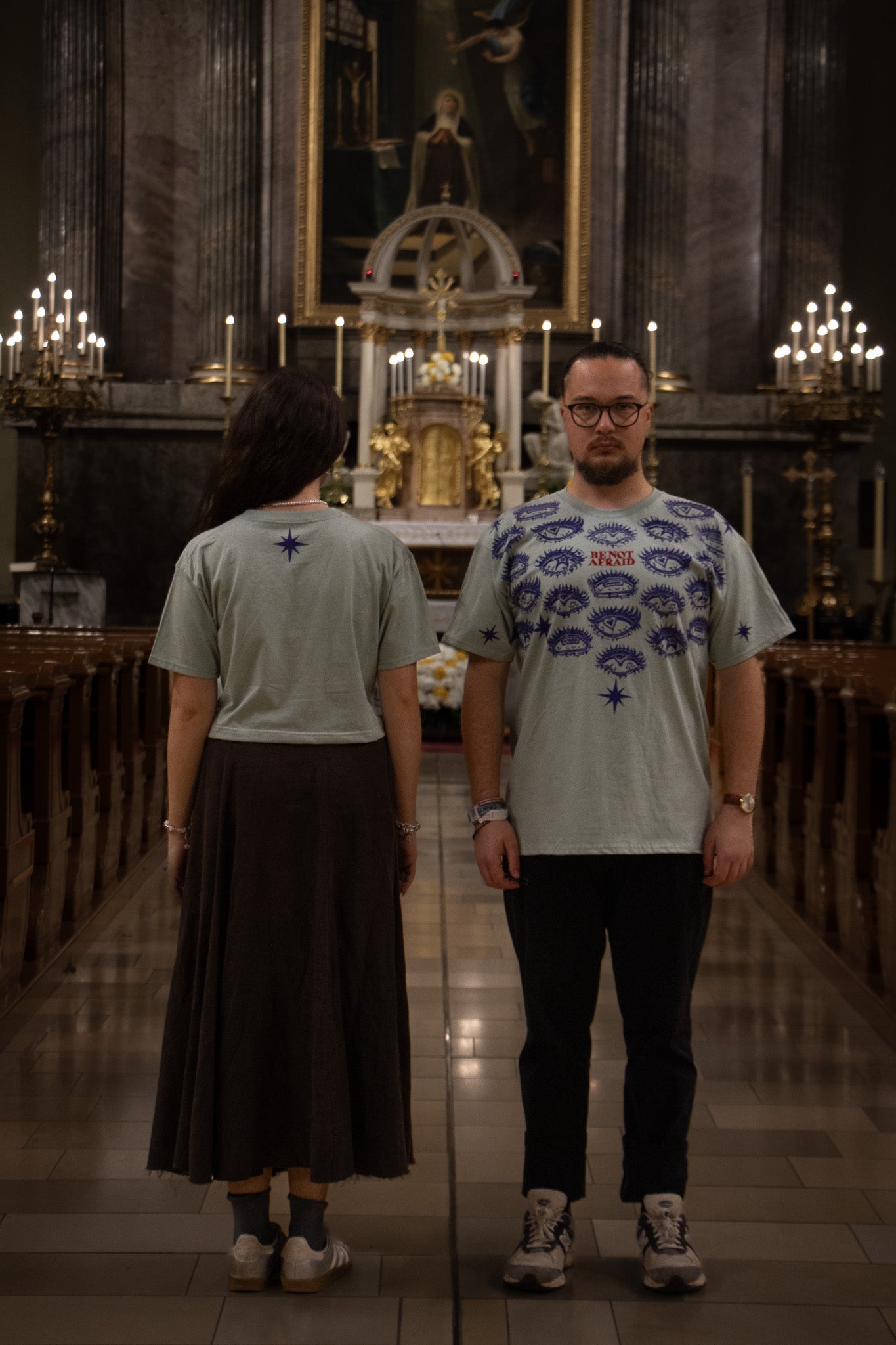 Egyedi, linográf technikával díszített pamutpóló a bibliai leírások alapján megjelenő angyalképet feldolgozva, középen a Szentírás egyik legfontosabb üzenetével. Az összes minta külön-külön kézzel, egyesével van a pólóra nyomva, így minden darabon valamivel eltérhet az elhelyezésük, ezáltal is biztosítva a megismételhetetlenséget.