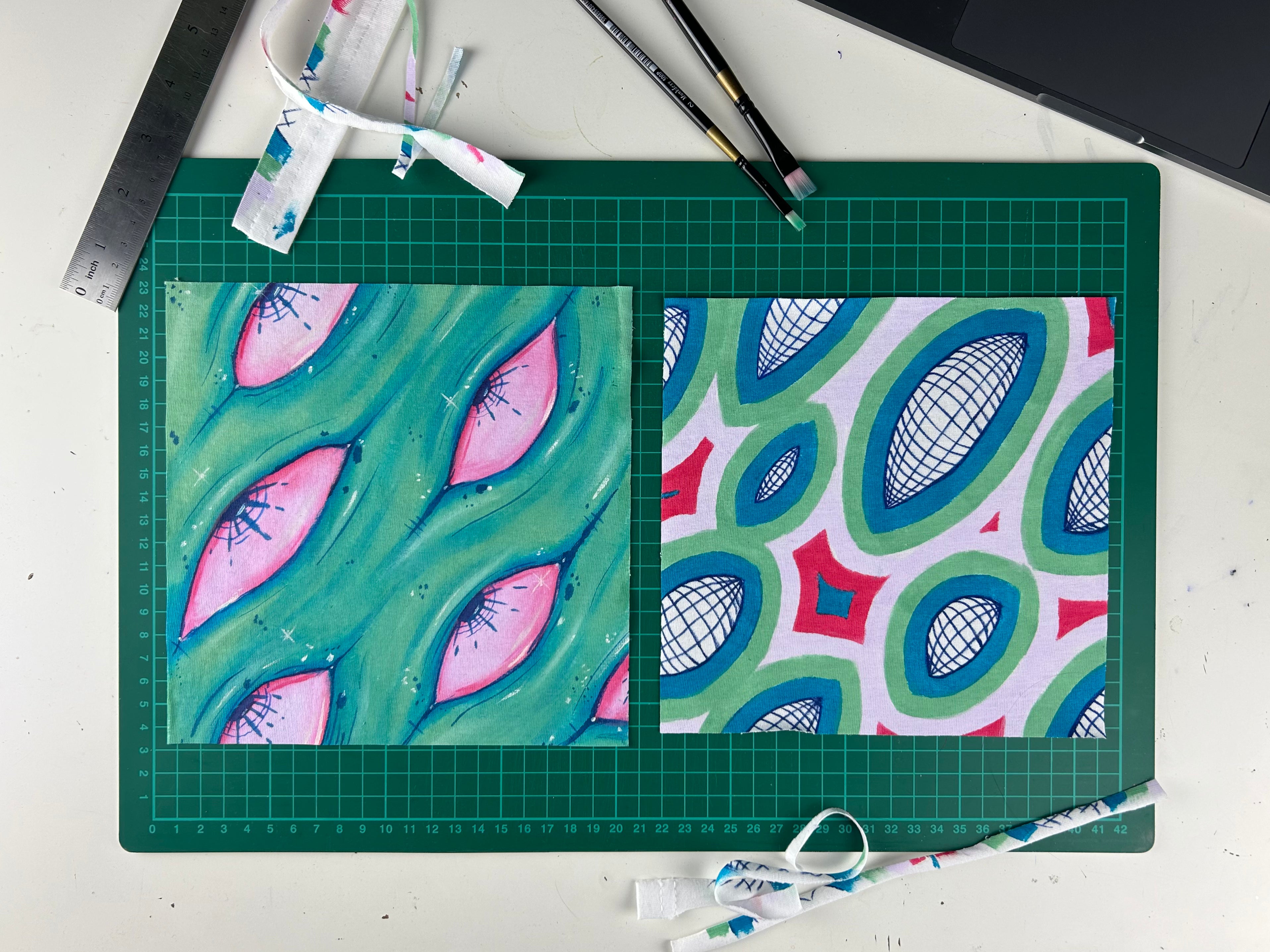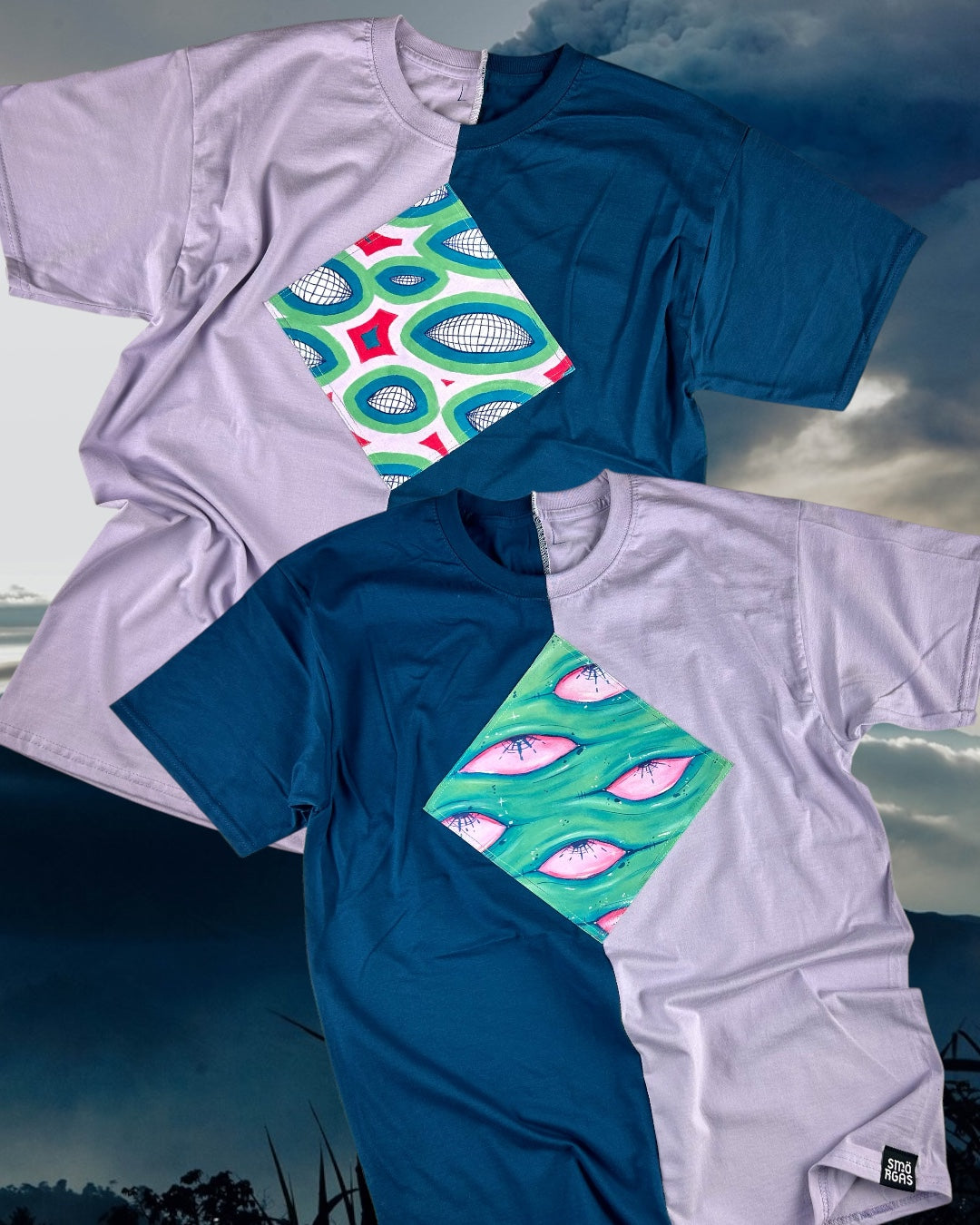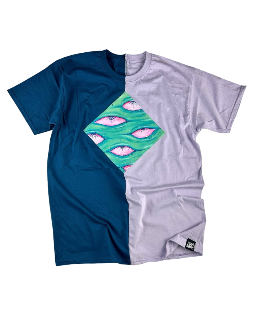 1/1 rövidujjú pamut póló kézzel festett, élénk felvarróval a mellkasán.